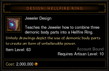 Once all of the organs have been collected, they can be combined at the Jeweler using a new design available for purchase from Squirt the Peddler. This design will teach your level 10 Jeweler four variations of the ring: the Hellfire Ring of Intelligence, the Hellfire Ring of Strength, the Hellfire Ring of Dexterity, and the Hellfire Ring of Vitality. Depending on which variation you choose, your ring will be guaranteed to roll one primary stat with a set value range of 170–200.